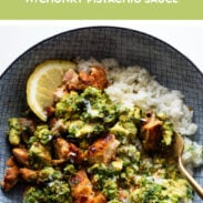 5. Serve: Cut the chicken into bite-sized pieces (makes it easier to build a bowl and eat)! Season with salt. Top with spoonfuls of the chunky pistachio sauce. I love this with rice and a salad. The flavors!! So good. Spooning sauce over chicken and rice in a bowl.