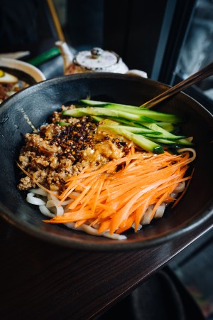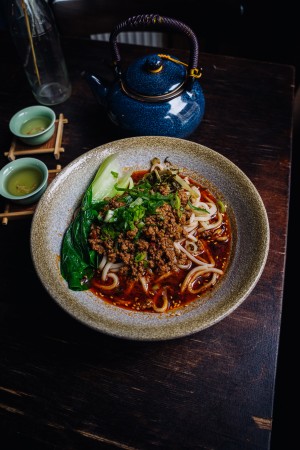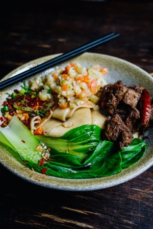 Of the many newer noodle spots, two are worth crossing the city for, even in this chilly weather. The first is Prenzlauer Berg’s Kongfu Chili, which makes a mean, hand-pulled belt noodle served in the northwestern youpo mian (oil-splashed) style, capped with minced garlic and chili flakes and doused in sizzling oil just before serving. (These bowls will be familiar to fans of the now-shuttered Grand Tang Xi Yu, though Kongfu Chili’s are less haphazard with more breadth of flavor.) The noodle texture is great and the seasonings top-notch. The standout dish is the “Three in One,” which combines the aforementioned youpo belt noodles with stewed beef and saozi: diced vegetables and pressed tofu sauteed in chili bean paste. The more (flavor) the merrier, I say.