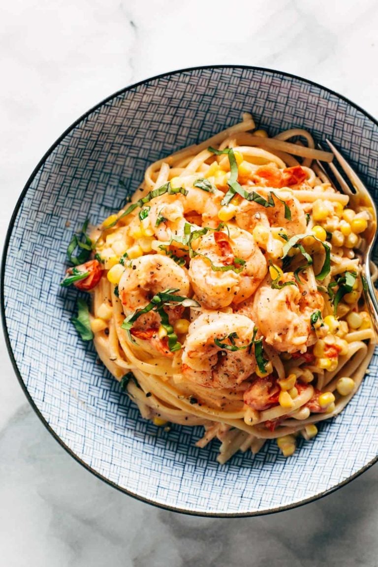 A seriously delicious fresh summer pasta. Creamy, silky noodles, garlicky shrimp, and a punch of fresh corn, cherry tomatoes, and basil.