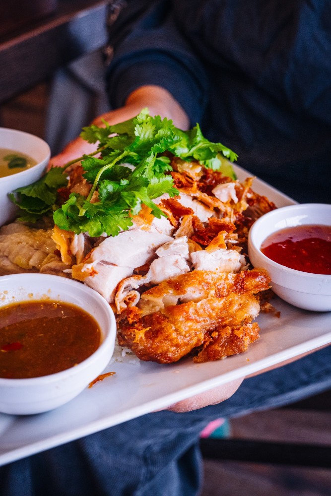 Go for the best Duck Larb in the city and make sure to order our chicken and rice half and half (half fried chicken, half boiled chicken)