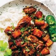 Sticky-sweet pork, juicy pineapple, fresh herbs, jalapeño, and crispy onions all served over a bed of fluffy coconut rice. SO GOOD!