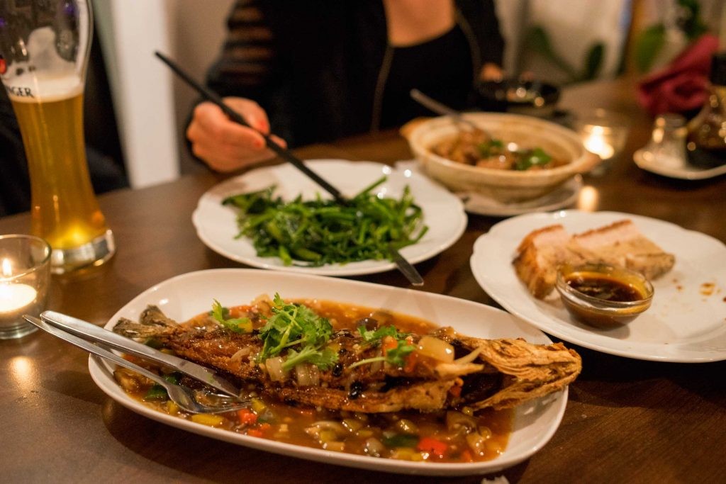 Moving on to the mains you will want to have a look at the chalkboards. On there you might find some creative inventions by chef Ben, like Sichuan inspired fish and chicken, ginseng chicken or proper old school Hong Kong staples like fried glass noodles with eggs and leeks, a dish whose delicious simplicity put a massive smile on my face. Another dish that made a lasting impression was the water spinach, a sublime dish from the seasonal menu that is best ordered with fermented tofu and where the lovely texture of these deeply green leaves is accentuated perfectly by the umami-packed flavours of the tofu. Absolute winner and I shall weep the day it goes off the menu. The deep fried Loupe de Mer with black bean sauce is another winner, although the fish is not cooked as perfectly as it comes at Da Jia Le, the crispy crust of the fish is coated with a killer sauce.
