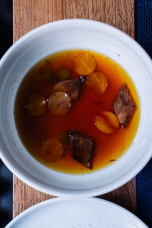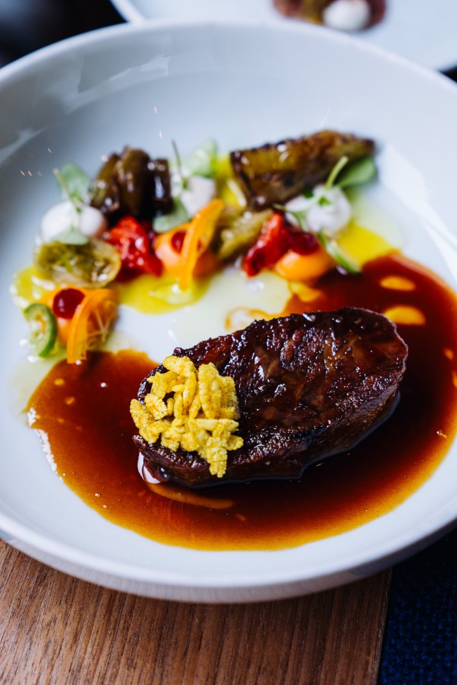 The main course, a Wagyu beef “Gulasch”, is a beast of a dish in three servings, packs a mighty flavor punch. First, a pillowy-soft braised beef piece, featuring a distinct crust, with red and green peppers, then, a raw serving of that same set and, finally, a fiercely intense consommé laden with spicy, Hungarian gulasch flavors.