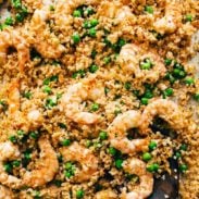 We’re loading a sheet pan with cauliflower rice and roasting it up with some sun-dried tomato pesto, throwing some juicy shrimp on top and a handful of springy green peas, brushing it with butter, and finishing with salt, pepper, and lots and lots of lemon juice.